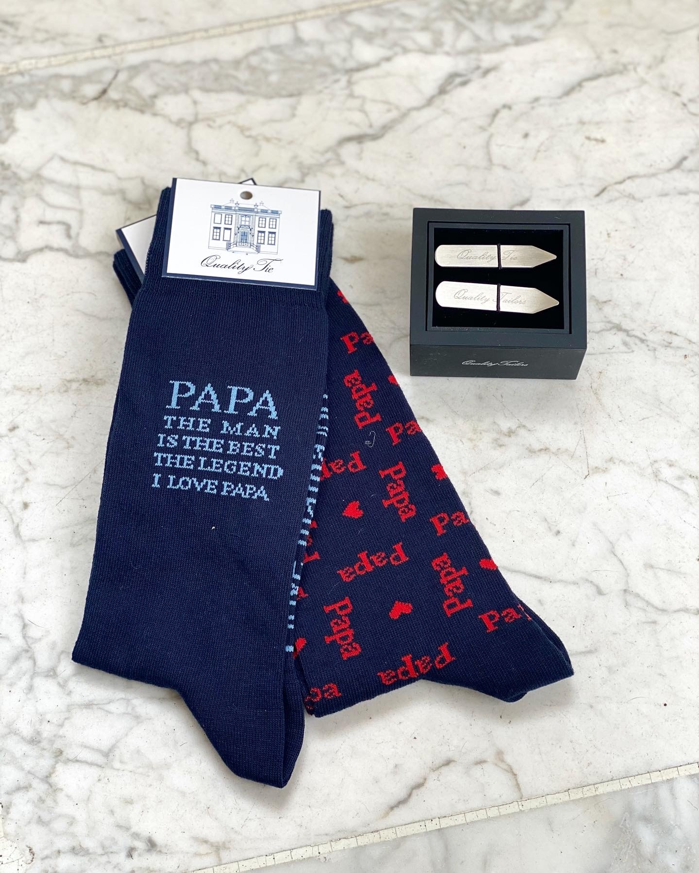 III: 2 pack vaderdag sokken - rood & blauw + collar bones + das (49,95 euro)